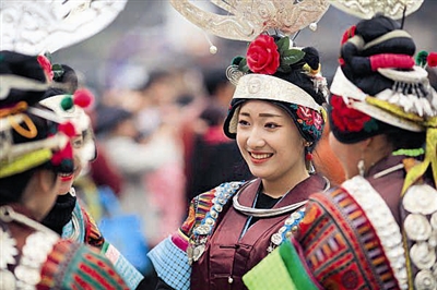 2月3日,在贵州省黔东南苗族侗族自治州丹寨县兴仁镇岩英村,盛装打扮的苗族女孩在一起聊天。