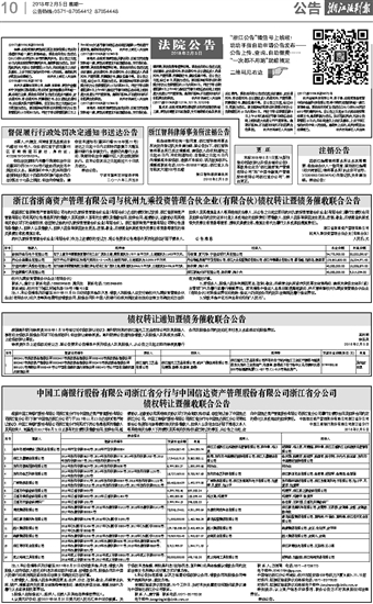 浙江省浙商资产管理有限公司与杭州九乘投资管理合伙企业(有限合伙)债权转让暨债务催收联合公告