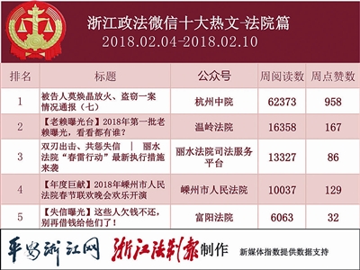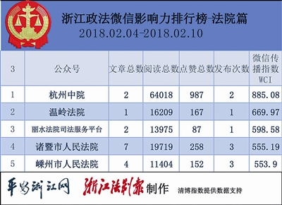 本期法院榜,“杭州中院”势头强劲,依然稳守第一。其《被告人莫焕晶放火、盗窃一案情况通报(七)》一文延续了上期的热度,阅读数破6万,领跑榜单。