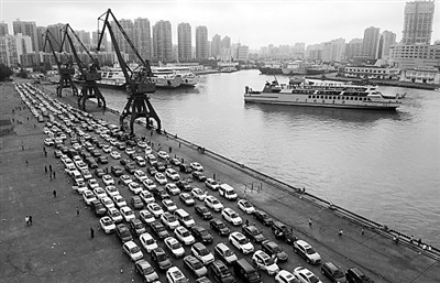 图为2月21日,在海口秀英港,大量车辆等待过海前往广东徐闻。