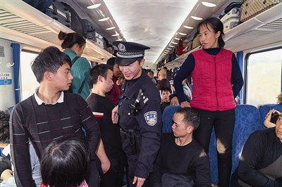 | 罗警长在满是乘客的车厢里“跋涉” |