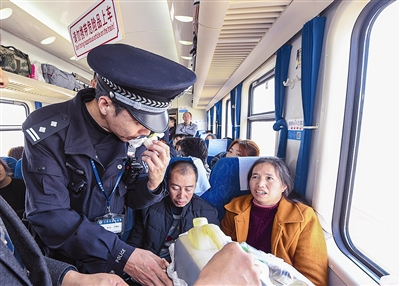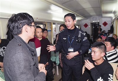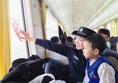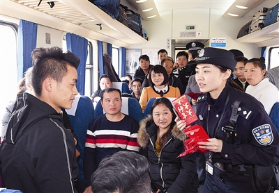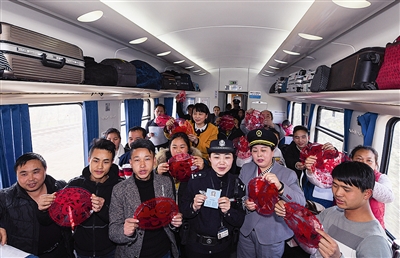 | 乘警魏聪和列车长王洪霞给旅客们发“红包” |