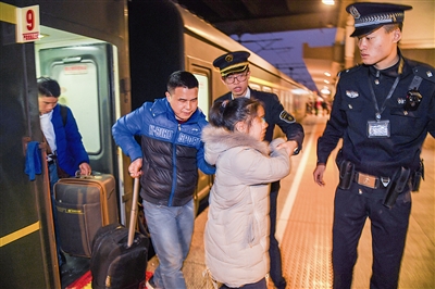 | 列车到达杭州站,乘务员和铁路杭州站派出所的民警将2名赴无锡务工的盲人推拿师搀扶下车 |