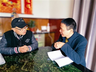 | 张曙光(右)到居民家里开展调解工作 |