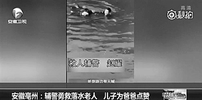 近日,安徽亳州一位钓鱼的老人不慎掉入河中。当时辅警赵耀带儿子正好路过,看见河中不断挣扎的老人,立刻跳下水救人,目前老人已无大碍。事发时,赵耀的儿子因担心爸爸大哭,之后明白爸爸是去救人,他觉得爸爸很勇敢,直说:“为爸爸点赞!”