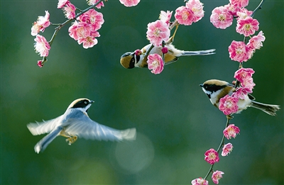 3月1日,在江苏省无锡市管社山庄,小鸟在梅花枝旁嬉戏。