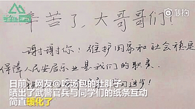 连日来,承担今年秦淮灯会安保任务的武警南京支队官兵,在备勤点南京二十七中,收到了同学们的纸条:“帅气的武警哥哥,感激你昨天将我的书放齐,我在抽屉里给你留了零食。”武警回条:“我们军队有纪律,不拿群众一针一线,为你们的心意点赞。”太暖了!