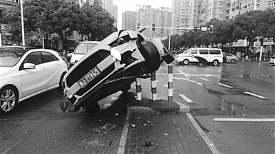 当被问到事故是如何发生的,男子告诉民警:“我在途经路口时,看了下微信,没想到车子一下子跑偏了撞向警示桩。当时一紧张,我又误把油门踩成刹车,车子就直接爬了上去,下不来了。”