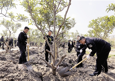 昨天是植树节,图为省乔司监狱的民警正在栽种枇杷树苗。挖坑、填土、浇水,大伙忙得不亦乐乎。他们表示,会坚持用自己的双手缔造绿色,建设美好的宜居环境,为绿水青山贡献一份力量。