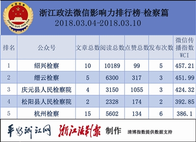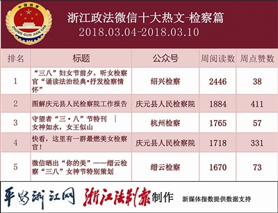 本期检察院榜,“绍兴检察”继续坐稳冠军之位。“缙云检察”“庆元县人民检察院”较上期进步明显,冲进前三名。检察院热文榜过节气氛最浓,不少公众号策划了“三八”妇女节的相关内容。“绍兴检察”的《“三八”妇女节前夕,听女检察官“诵读法治经典·抒发检察情怀”》一文,拿下了热文榜第一名。