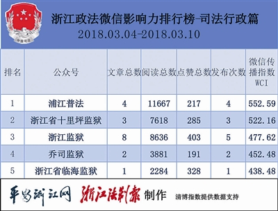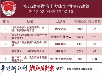 本期司法行政榜,监狱系统“发力”了,第二名到第五名均是监狱系统的微信公众号。热文榜中,黑马“淳安司法”《〈反家暴法〉实施两周年:女性,你要保护好自己》在反家暴法实施两周年当天进行推送,阅读量可嘉,获得第一名。