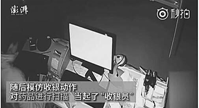近日,在安徽明光,一名小偷撬开某药店大门欲盗窃财物,发现收银抽屉内未放有钱款,于是就模仿收银员扫描药物收银“过瘾”。随后在一旁的地上睡了约3小时后,盗走店内商品离开。