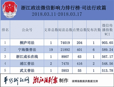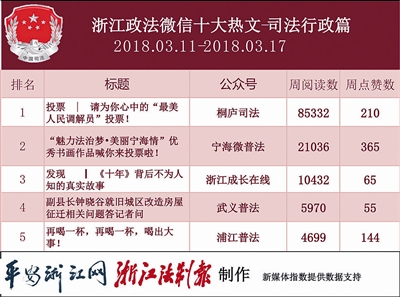 此前默默无闻的“桐庐司法”和“宁海微普法”这次发力了,均凭借投票活动“上位”,分别占据热文榜第一和第二的位置。其中,“桐庐司法”的《投票丨请为你心中的“最美人民调解员”投票!》一文,阅读量遥遥领先,可见活动影响力之大。
