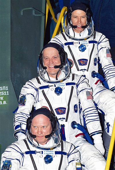 3月21日,在哈萨克斯坦境内的拜科努尔发射场,三名宇航员站在火箭旁。