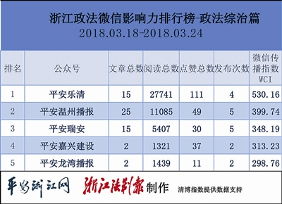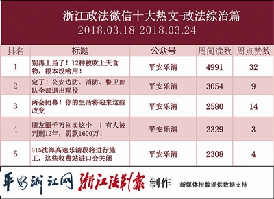 本期政法委榜,“平安乐清”“平安温州播报”“平安瑞安”分别获得第一、二、三名。“平安乐清”出类拔萃,在热文榜前十中,占据了九个席位,其中,《别再上当了!12种被吹上天食物,根本没啥用!》一文收获近5千阅读量。