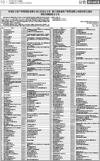中国东方资产管理股份有限公司江苏省分公司 浙江省浙商资产管理有限公司债权转让通知 暨债务催收联合公告