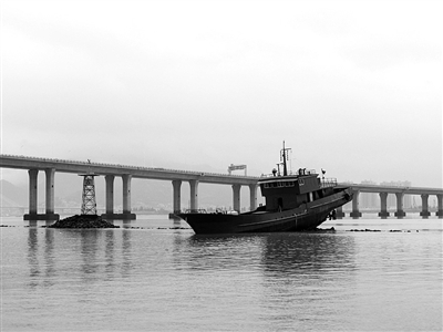 | 搁浅在瓯越大桥下游潜坝上的无主船舶 |