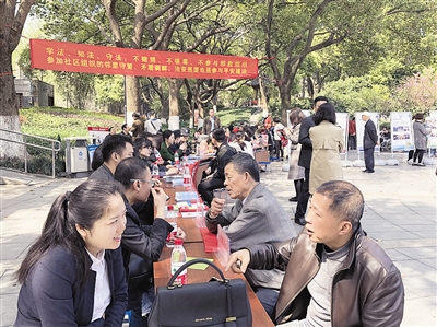 3月28日,杭州市下城区综治办在朝晖公园开展了综治宣传月集中宣传活动。下城区综治办、防范办、公安局、司法局等10多个部门的相关人员参加了此次活动。以此次宣传活动为契机,下城区将组建志愿者小分队,以“宣传平安建设、提升平安三率”为主题,开展进千家走万户的综治宣传活动。本报记者 陈岚 实习生 杜思涛