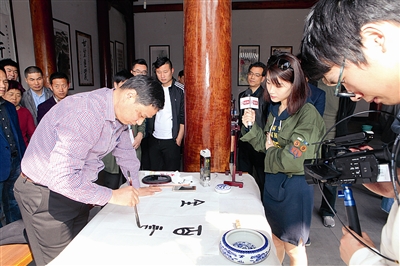 直播小组来到村文化礼堂,来自浙江省诗词与楹联协会的艺术家们正在即兴创作,书写下他们在花园村采风之后的感受。