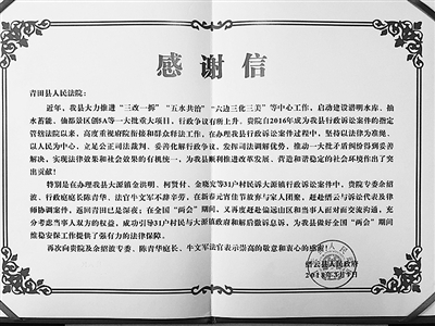 近日,缙云县政府向青田法院发来感谢信,对青田法院成为缙云行政案件管辖法院两年来的行政审判工作及化解了行政诉讼案件31件表示感谢。通讯员 叶旭耀 摄