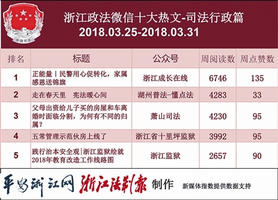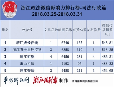 本期司法行政榜的前三分别是“浙江成长在线”“浙江省十里坪监狱”和“浙江监狱”。“浙江成长在线”的热文《正能量|民警用心促转化,家属感恩送锦旗》讲述了民警帮助未成年服刑人员“蜕变”的故事,感人至深,赢得不少点击量。