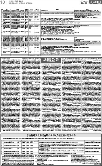 序号债务人资产包 债权所在地本金(元) 利息(元) 抵押物保证人71杭州祺凯锻造有限公司 江苏银行杭州分行2017年第一批不良资产包 杭州萧山 116,865.17 2,642,401.74 抵押物拍卖抵扣本金杭州征欣家具有限公司、浙江振琳控股集团有限公司、徐国苗、冯霞72绍兴县龙锋纺织品有限公司 工商银行浙江省分行2017年第七批不良资产包1(绍兴地区) 绍兴柯桥 4,999,442.65 1,029,451.92 浙江友谊染织有限公司、绍兴天怡包装有限公司、王文江、秋文美、周尧忠、张君钗,毛关根,杨爱芳,王阿龙,斯利娟,73浙江金宸三普换热器有限公司 工商银行浙江省分行2017年第七批不良资产包1(绍兴地区) 绍兴诸暨 14,299,871.63 553,809.45 厂房。位于诸暨市阮市镇金岭村,为诸暨市华夏机电科技有限公司所有工业房地产,厂房面积10909.56平。浙江三普控股集团有限公司、 何金汉、金惠娜74绍兴县福麦纺织品有限公司 工商银行浙江省分行2017年第七批不良资产包1(绍兴地区) 绍兴柯桥 7,958,667.98 1,867,879.49 绍兴欧技光电有限公司,绍兴市鼎华机动车驾驶员培训有限公司、绍兴市润德纺织品有限公司,沈卫定,杜品芳、赵如生、许钢平75兰溪市华绒纺织有限公司 工商银行浙江省分行2017年第七批不良资产包2(金华地区) 金华兰溪 4,299,738.46 756,716.25 冯建芳、浙江彩之源纺织有限公司76兰溪市天绒纺织原料厂 工商银行浙江省分行2017年第七批不良资产包2(金华地区) 金华兰溪 2,999,994.13 374,658.98 兰溪市庆樟纺织厂,担保额400万、余汝慧、王淑娟,担保额400万77武义海阔工具有限公司 工商银行浙江省分行2017年第七批不良资产包2(金华地区) 金华武义 30,000,000.00 1,143,423.17 抵押物1:厂房。武义海阔工具有限公司自有位于武义县东干凤凰山工业区,土地使用权面积17174.92平米,建筑物面积14924.75平;抵押物2:厂房。武义海阔工具有限公司自有位于武义县东干凤凰山工业区,土地使用权面积17923.19平,建筑物面积14318.27平。胡伟进、张晓姝78兰溪市俊泽纺织有限公司 工商银行浙江省分行2017年第七批不良资产包2(金华地区) 金华兰溪 1,430,000.00 218,056.70 抵押物1: 住宅。毛文高名下位于兰溪市兰江街道振兴路52号7单元101室的住宅,建筑面积为 134.68 平。抵押物2: 住宅。冯建芳名下位于位于金华市婺城区华龙南街1008号蓝湾花园39幢108室的商业用房,房屋面积140.26平,另有储藏室面积为40.98平冯建平,徐素芳79浙江博宇实业有限公司 工商银行浙江省分行2017年第七批不良资产包2(金华地区) 金华永康 8,912,933.07 1,613,191.39 浙江双健机电有限公司,王克刚、王小惠,80浙江康发工贸有限公司 工商银行浙江省分行2017年第八批不良资产包3(金华地区) 金华东阳 23,989,300.23 909,809.84 抵押物1:工业厂房土地。企业自有,抵押物位于东阳市南马镇葛府村葛三;土地16083平(24亩),建筑34227.08平 胡向上、胡卫燕81兰溪今朝商贸有限公司 工行浙江省分行2017年第4季度受托资产包4(金华地区) 金华兰溪 54,268,581.85 12,015,803.60 商业房。兰溪今朝商贸有限公司自有产权,位于兰溪市劳动路74号今朝商厦裙楼第二层,建筑物面积为3753.03平,土地使用权面积为929.6平, 冯映、吕旭东82浙江今朝煤炭有限公司 工行浙江省分行2017年第4季度受托资产包4(金华地区) 金华兰溪 45,416,106.83 10,481,979.23 抵押物1:商业房。兰溪今朝商贸有限公司所有的位于兰溪市劳动路74号的,建筑面积1652.21平,土地使用权面积409.20平 抵押物2:写字楼。衡阳市今朝置业有限公司所有的位于湖南省衡阳市高新区解放大道19号丰越大厦8-25层办公用房。建筑面积9770.12平, 抵押物3:写字楼。吕旭东、冯映以位于金华市双溪西路南侧金衡街16号办公用房产提供抵押担保。建筑面积377.81平 抵押物4:住宅。抵押人吕旭东、冯映以位于金华市安文路262号婺景苑18幢3-1204室住宅提供抵押担保,建筑面积102.81平, 冯映、吕旭东83兰溪市天羽纺织有限公司 工行浙江省分行2017年第4季度受托资产包4(金华地区) 金华兰溪 2,561,045.63 1,964,277.37 84浙江丰信商贸有限公司 工行浙江省分行2017年第4季度受托资产包3(衢州23户) 衢州柯城 2,902,570.36 1,275,764.58 邱生根85江山市艺都时尚电影有限公司 工行浙江省分行2017年第4季度受托资产包3(衢州23户) 衢州江山 25,064,475.18 3,760,982.97 商业用房。江山市环城西路83号,1-4楼,建筑5277.71平/86常山县路路通手机大卖场 工行浙江省分行2017年第4季度受托资产包3(衢州23户) 衢州常山 5,448,811.96 1,548,016.12 商铺。衢州常山县文峰街道天马路37-6号临街商铺。房屋面积75.42平 常山县路路通手机大卖场87衢州市区煌室灯具城 工行浙江省分行2017年第4季度受托资产包3(衢州23户) 衢州柯城 334,584.90 563,179.32 龚水祥、郑小芬88浙江铁成工贸有限公司工行浙江省分行2017年第4季度受托资产包4(金华地区)金华武义 10,181,339.99 4,916,507.60 保证人:浙江强大实业有限公司, 共同偿债人一:姚帅,同偿债人二:冯蕴89浙江黄金甲工贸有限公司工行浙江省分行2017年第4季度受托资产包4(金华地区)金华永康 43,944,747.08 14,437,139.93 浙江米罗工贸有限公司,夏松俊、卢红果、夏松燎、卢晶,90浙江吉能工贸有限公司工行浙江省分行2017年第4季度受托资产包4(金华地区)金华永康 716,149.29 2,163,814.21 浙江强大实业有限公司,姚帅,冯蕴91浙江巨合链条有限公司工行浙江省分行2017年第4季度受托资产包4(金华地区)金华永康 2,077,793.00 1,344,867.11 朱振武、吕荷