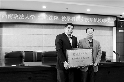 近日,温岭法院与西南政法大学签订《共建教学科研实践基地合作协议》,双方就教育咨询、培训服务、信息交流、学生实习、调研合作等事项达成协作共识,共建法学专业实践教育基地,共同培养优秀的法律人才。图为教学科研实践基地的授牌仪式现场。通讯员 李洁