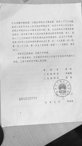 下城区法院在审查学员起诉案件的过程中,发现早在今年3月16日北京天天向上艺术培训有限公司就已经被江苏无锡市公安局以涉嫌诈骗罪立案侦查。法院认为,该学员的起诉不符合民事诉讼受理条件,并于4月2日裁定对案件不予受理。
