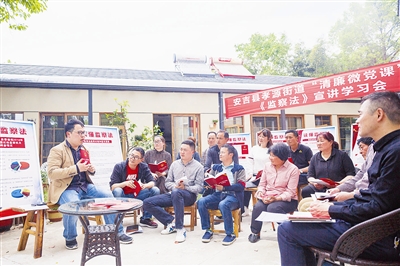 近日,安吉县孝源街道开展“清廉微党课”暨《中华人民共和国监察法》宣传学习会进农家活动,向百姓普及监察法内容,营造风清气正的廉政氛围。张卉 摄