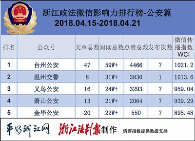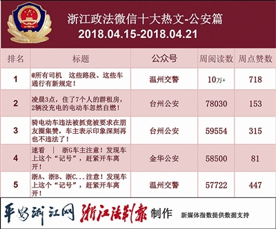 本期公安榜,“台州公安”获第一名。热文榜前十名中,“温州交警”有5篇文章上榜,其中《@所有司机 这些路段、这些车通行有新规定!》拿下第一名,它也是本周总榜单中,唯一一篇阅读量达10万+的热文。