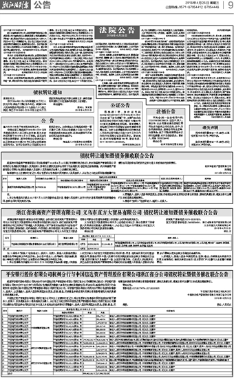 浙江省浙商资产管理有限公司 义乌市直方大贸易有限公司 债权转让通知暨债务催收联合公告