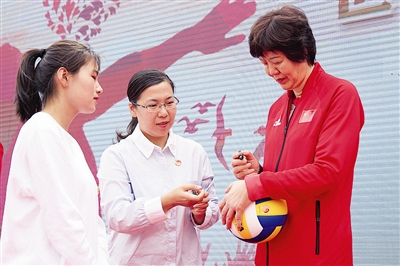 中国女排总教练郎平率中国女排队员杨方旭、段放参加活动。活动现场,郎平和女排队员为2018世界排球联赛(宁波北仑)志愿者队伍授旗,并在义卖排球上签名。义卖所得资金将全部用于宁波市志愿服务基金及公益项目。
