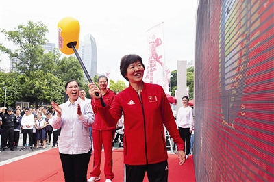 | 郎平用榔头击打屏幕上的排球启动活动 |