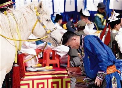 5月6日,在成吉思汗陵,一名祭拜者用头触碰白马祈祷获得好运气。