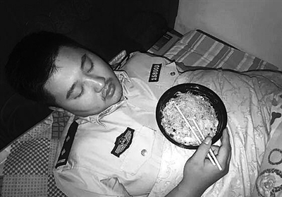 本报讯 近日,浦江民警的微信朋友圈,被一张照片刷屏了,网友纷纷表示心疼。照片中,一名民警躺在床上酣睡,神情颇为疲惫,而他身上还放着半碗已经凉透的炒粉干。