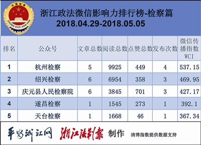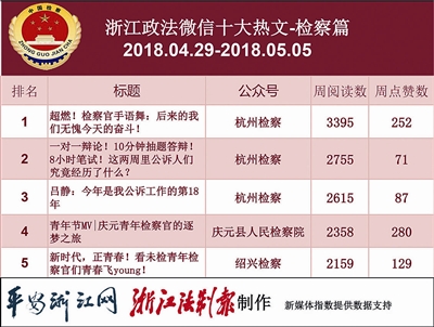 “杭州检察”发挥稳定,继续稳坐检察院榜的头把交椅。该公号的《超燃!检察官手语舞:后来的我们无愧今天的奋斗!》一文内容新颖,一段时长3分钟的杭州检察青年干警手语舞视频成功吸睛,不少网友留言“帅爆了”。