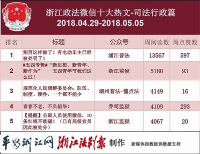 本期司法行政热文榜上,唯一一篇阅读量破万的文章是“浦江普法”的《别再这样做了!有电动车主已经被处罚了!》,此文点赞数也领跑榜单。骑电动车的人可不少,大家纷纷点进来看看,再顺手转发下,点击量自然就上去了。