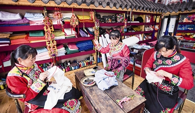 | 北川新县城内,羌族妇女们在绣制羌绣产品 (5月2日摄) |