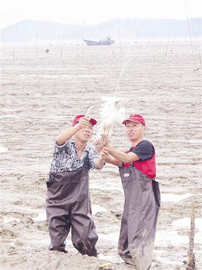 昨天一大早,温岭市箬横镇的党员志愿者们趁着退潮时,来到南海涂开展营救海涂鸟类行动。