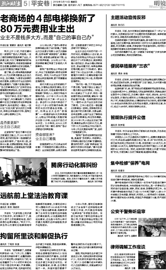 据了解,这4部电梯是刚换新的,80万元的费用都是业主自己作主,自行筹款。“4部客运扶梯的成功更换,主要归功于业主自身和物业管理方。”在整个改造过程中,“自己的事情自己办”这样的自治管理模式贯穿始终,百丈街道党工委书记邵英豪告诉记者。