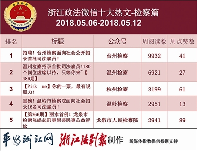 本期检察院热文榜,“招聘”主题成为重头戏,有8家单位正在公开招聘。其中,收获阅读数最高的是“台州检察”的《招聘!台州检察面向社会公开招录首批司法雇员!》。想去检察院工作的小伙伴,赶紧准备好简历吧。
