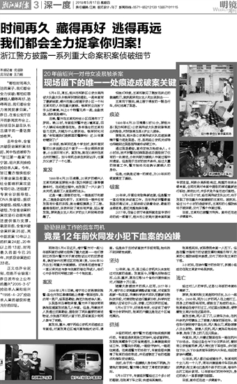 去年全年,全省共破获命案积案88起,其中包括被称为“浙江第一悬案”的宁波、绍兴系列持枪抢劫杀人案。今年,浙江警方继续组织开展命案及有重大社会影响积案攻坚专项行动,还组建了专家会诊指导组、DNA突破组、指纹突破组、视频人像突破组,为全省命案积案攻坚行动顺利推进提供强力支撑。截至目前,全省共破命案积案26起,其中距发案10年以上的积案24起、20年以上的13起,时间最久的距今已26年,共抓获命案逃犯33名。