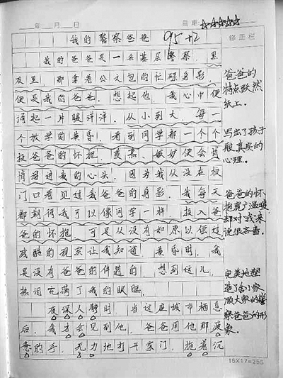 这篇文章的作者小邵才11岁,就读温州某小学。小邵的这篇作文,班主任孔老师不仅给出了最高分五颗星,更是写下了精彩的评语:“爸爸的怀抱宽广温暖,对小邵来说却很吝啬,但同时,小邵也为爸爸是一名舍小家顾大家的警察而感到自豪,爸爸的形象是完美而高大的。”孔老师称,自己看到这篇文章时十分感动,立即将文章传给了小邵的爸爸——温州市龙湾区公安分局刑侦大队民警邵浙和。