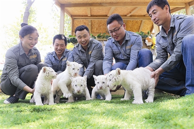 5月20日,在济南野生动物世界,工作人员带着五胞胎雪虎宝宝一起亮相。