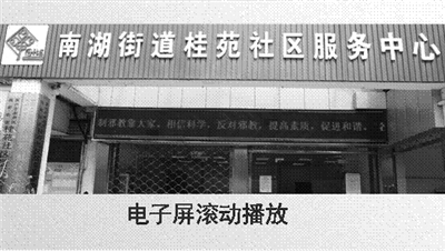 南湖区在南湖街道桂苑社区建设省级红色文化反邪教示范基地,将反邪教元素融入社区公园、广场、绿地、围墙等景观,分为科技、长廊、广场、草坪、警钟和道德讲堂等六大板块,居民在休闲的同时,受到潜移默化的熏陶,激发识邪教防邪教的内在动力。同时,南湖区积极指导各镇(街道)在所有社区(村居)开展“四个一”,即一块长期固定的反邪教警示牌、一处反邪教警示教育小公园、一处文体活动反邪教场所、一个反邪教图书阅览室为主要内容的反邪教宣传阵地建设。