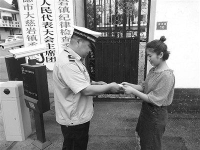 本报讯 5月21日下午,建德市大慈岩镇政府门口,广西女孩王某拿着失而复得的身份证,对交通协管员叶滨一再道谢。