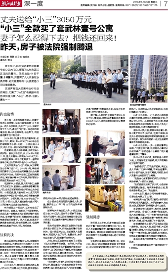 丈夫送给“小三”3050万元 “小三”全款买了套武林壹号公寓 妻子怎么忍得下去?把钱还回来! 昨天,房子被法院强制腾退