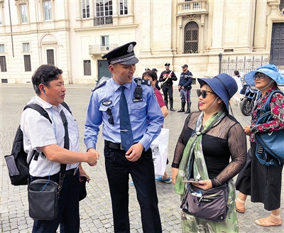 据了解,此次赴意联巡的10名队员主要来自浙江省公安机关,在国内从事巡特警、出入境管理、派出所等基层一线执勤执法工作。图为来自金华市公安局出入境管理局的民警程勐在罗马Navona广场与来自浙江的游客交流,提醒旅游安全注意事项。