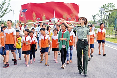 5月28日,孩子们在参观南昌军事装备展示中心展示的军事装备。当日,中国建筑第二工程局有限公司的志愿者组织江西省宜丰县澄塘中心小学的留守儿童参观南昌军事装备展示中心,让孩子们了解国防科技知识,接受爱国主义教育。