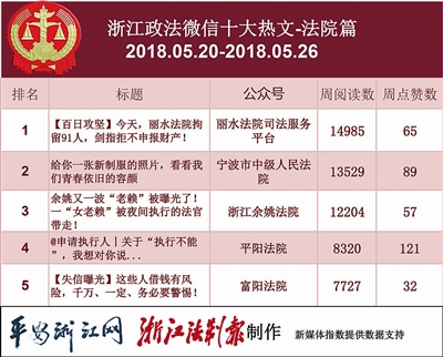 本期法院热文榜,三个公号的热文阅读数破万。“丽水法院司法服务平台”的《【百日攻坚】今天,丽水法院拘留91人,剑指拒不申报财产!》最吸睛,该文图文并茂,颜值颇高,展示了一线干警在打击失信被执行人时的执法风采。